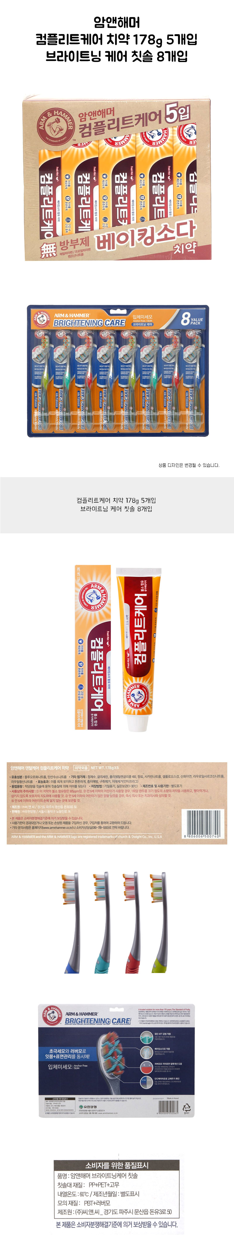 암앤해머 컴플리트 케어 치약 178g 5입 브라이트닝 케어 칫솔 8입 세트