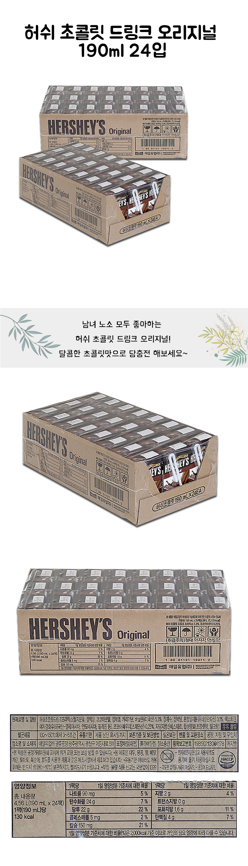 허쉬 초콜릿 드링크 오리지널 190ml 24입 음료 간식 초콜렛