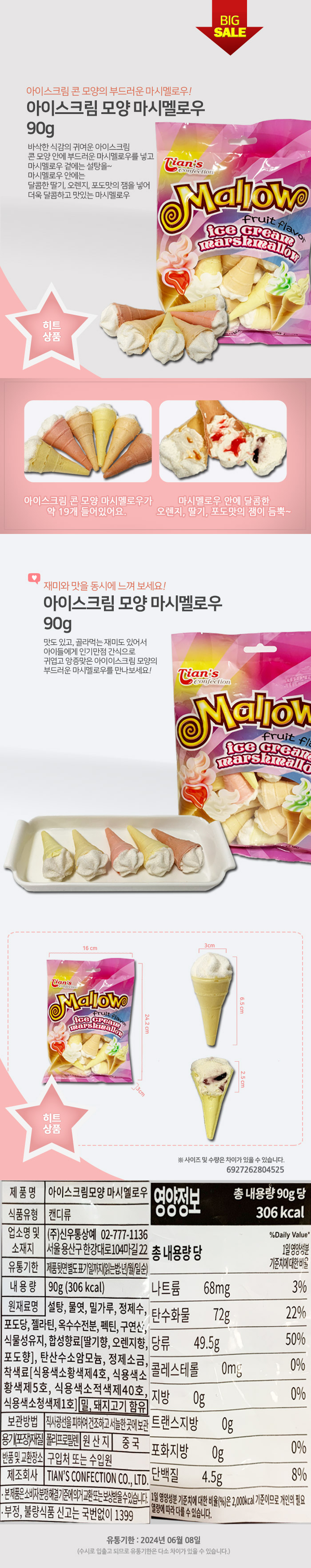 Tian 아이스크림 모양 콘 과자 마시멜로우 90g