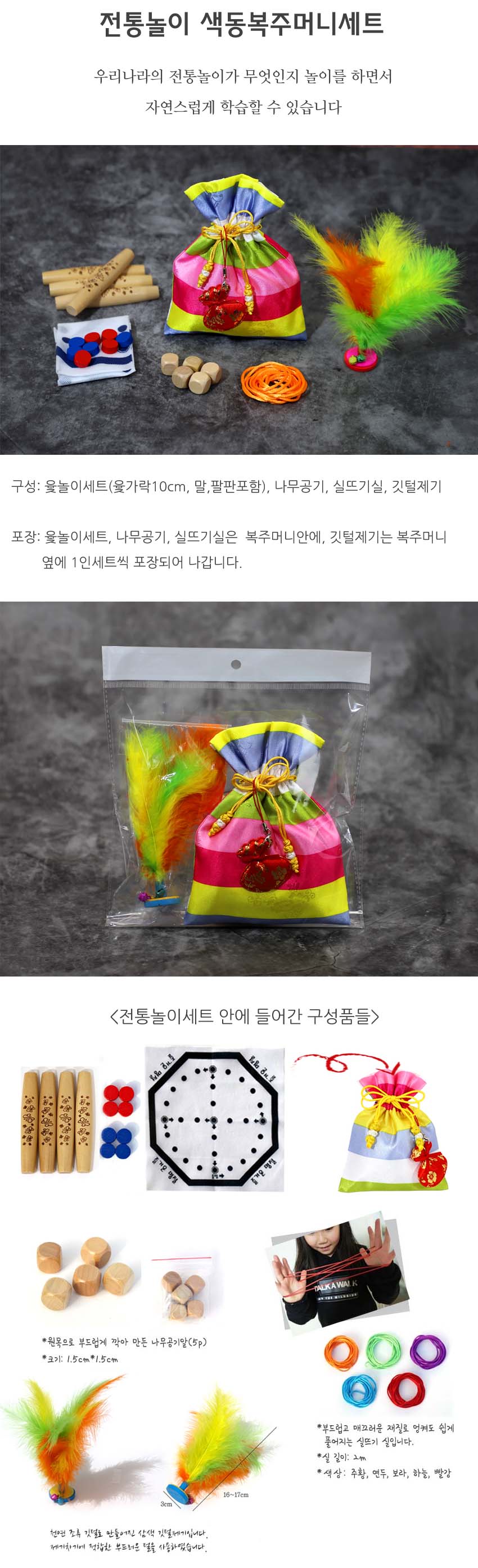 전통놀이 색동복주머니세트(윷놀이/나무공기/실뜨기실/깃털제기)
