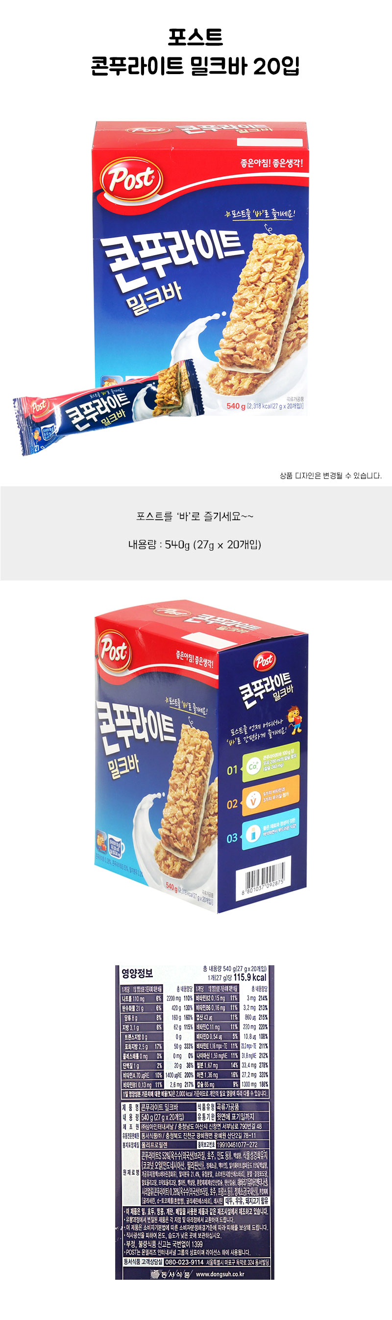 포스트 콘푸라이트 밀크바 20입 540g 아침 식사 대용 건강 간식 시리얼 씨리얼