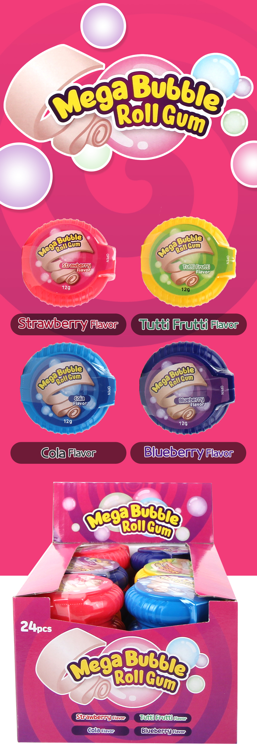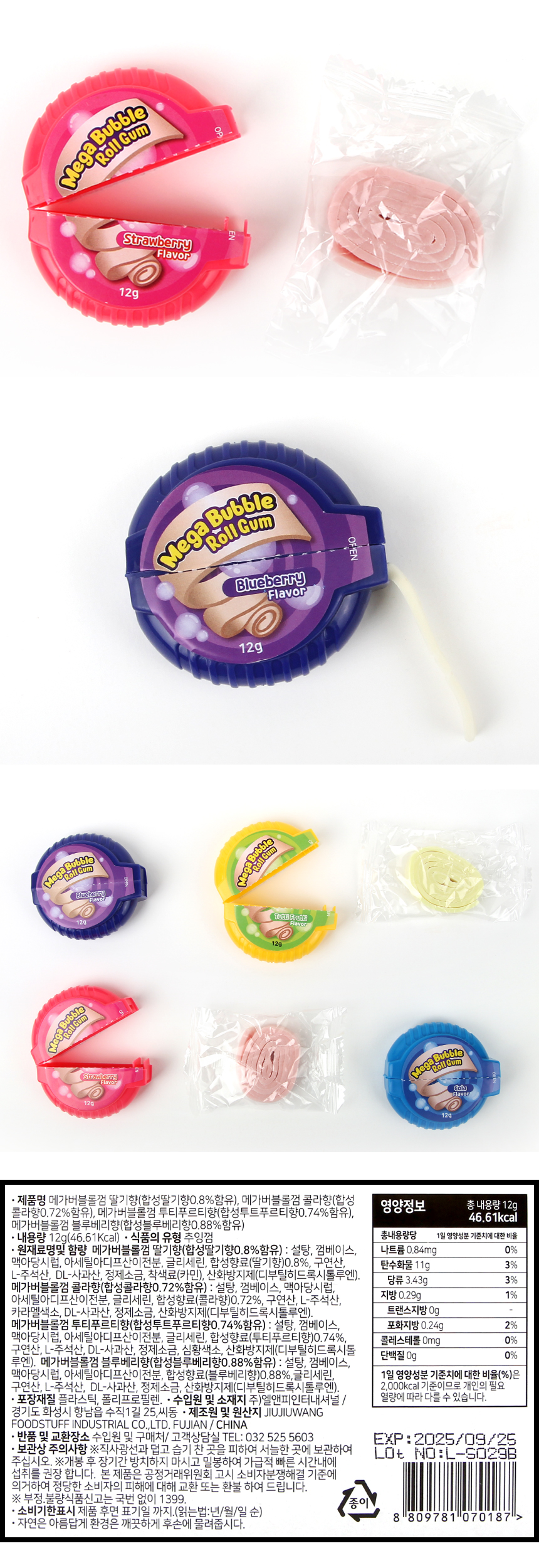 메가 버블 롤 껌 12g 딸기맛 콜라맛 블루베리맛 투티프루티맛 껌 랜덤배송