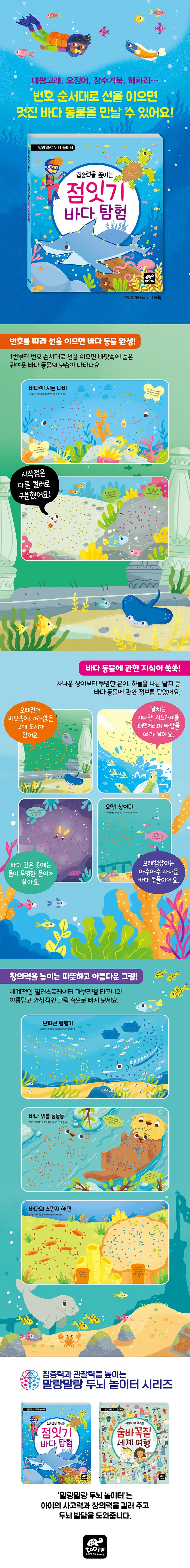 점잇기는 아이들에게 인기 있는 놀이 활동이에요. 1번부터 순서대로 점을 잇기만 하면 멋진 그림이 탄생하니까요. 그림을 못 그려도 상관없어요. 연필 한 자루만 있으면 멋진 예술가가 된답니다. 〈집중력을 높이는 점잇기 바다 탐험〉은 바다에 사는 약 80마리의 바다 동물과 난파선, 잠수함, 고대 유물 등 환상적인 바닷속을 경험할 수 있도록 구성한 점잇기 놀이북입니다. 번호 순서대로 선을 이으면 대왕고래부터 상어, 문어, 거북이까지 사납고 무서운 갖가지 바다 동물을 만날 수 있어요. 또 바다 동물마다 생김새나 특징 등의 간단한 정보를 담아 더욱 재미있게 놀이 활동에 참여할 수 있어요. 이 책 한 권을 모두 끝내면, 바다 깊은 곳에 투명 문어가 산다는 사실과 바다거북이 왜 초록색인지, 산호초에는 누가 사는지 등 바다 동물에 관한 지식을 차곡차곡 쌓을 수 있답니다. 재미있는 점잇기 놀이를 하며 집중력과 사고력을 키우고 바다 동물에 관한 지식도 쌓아요!