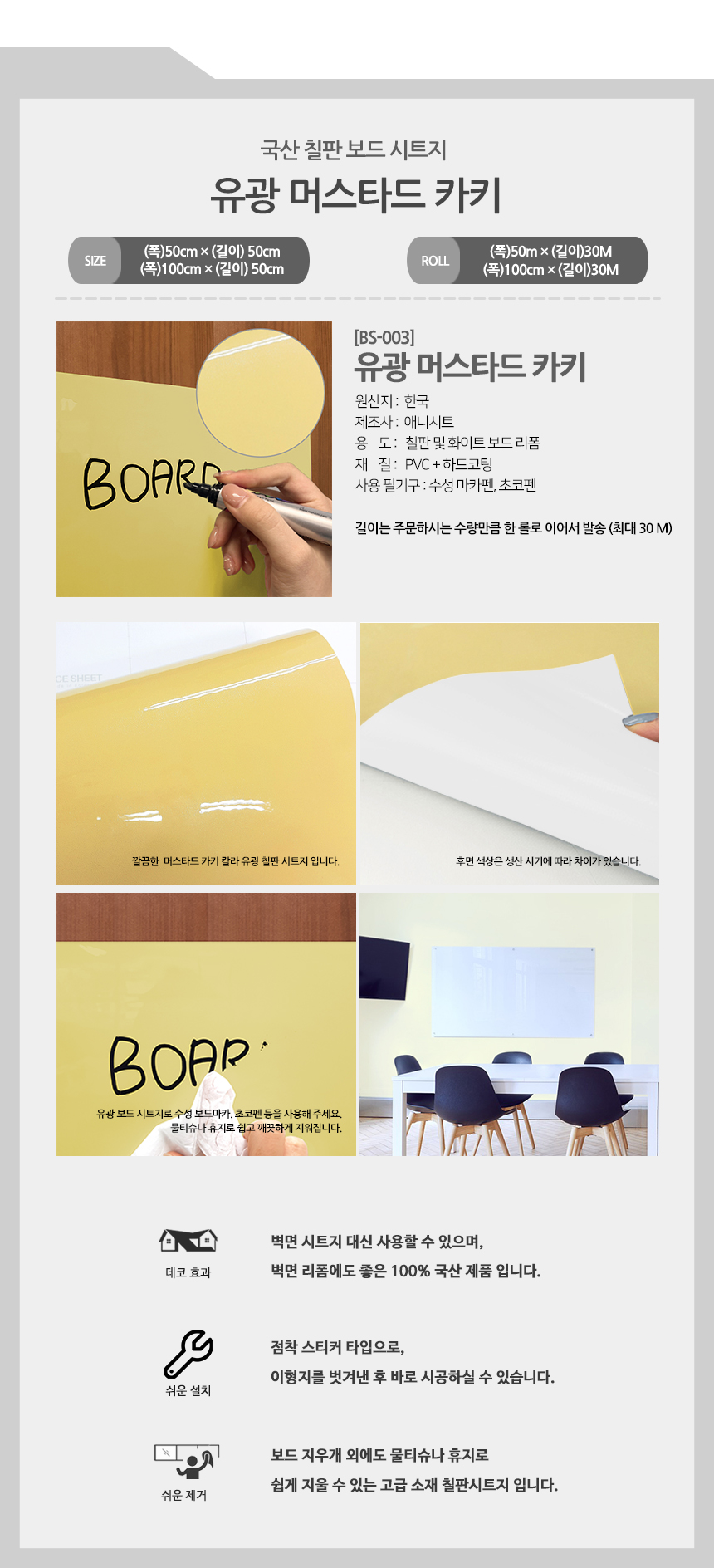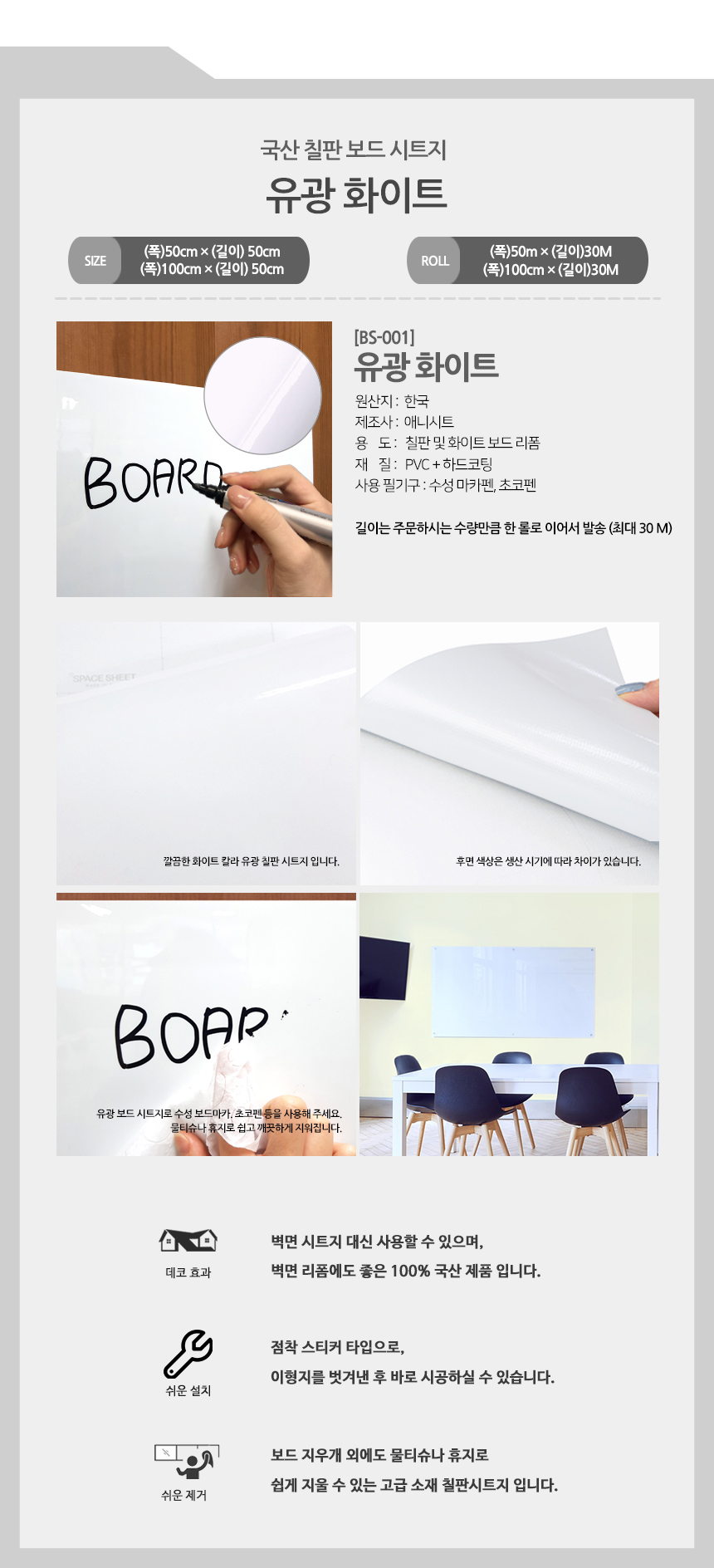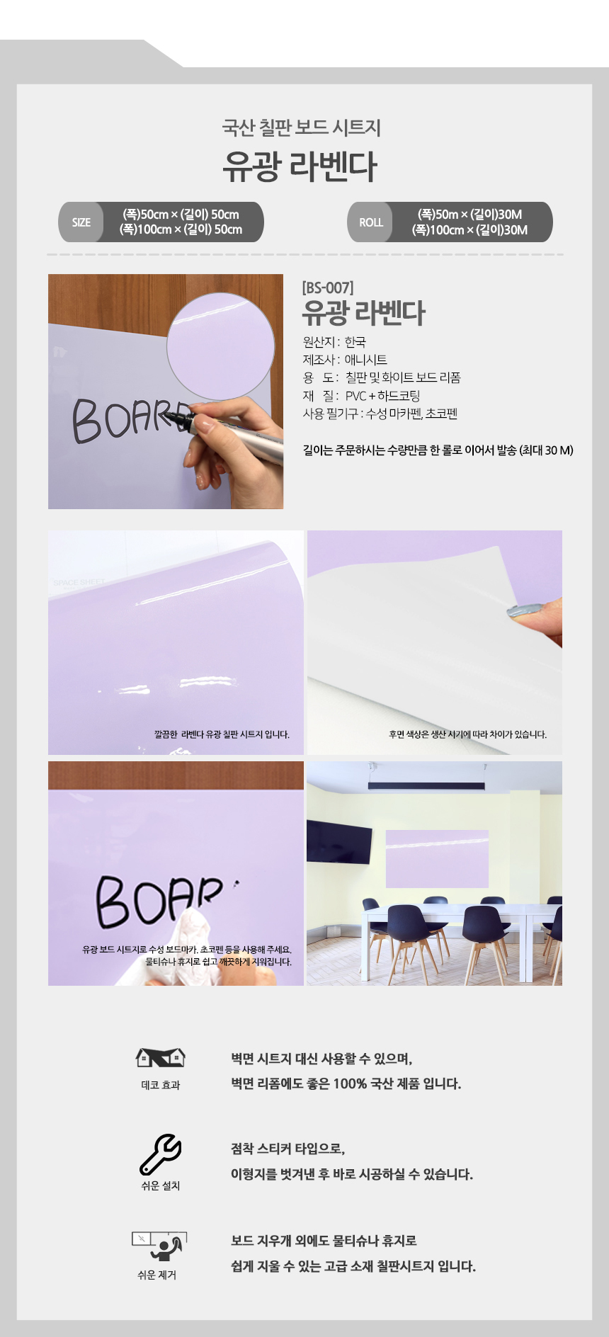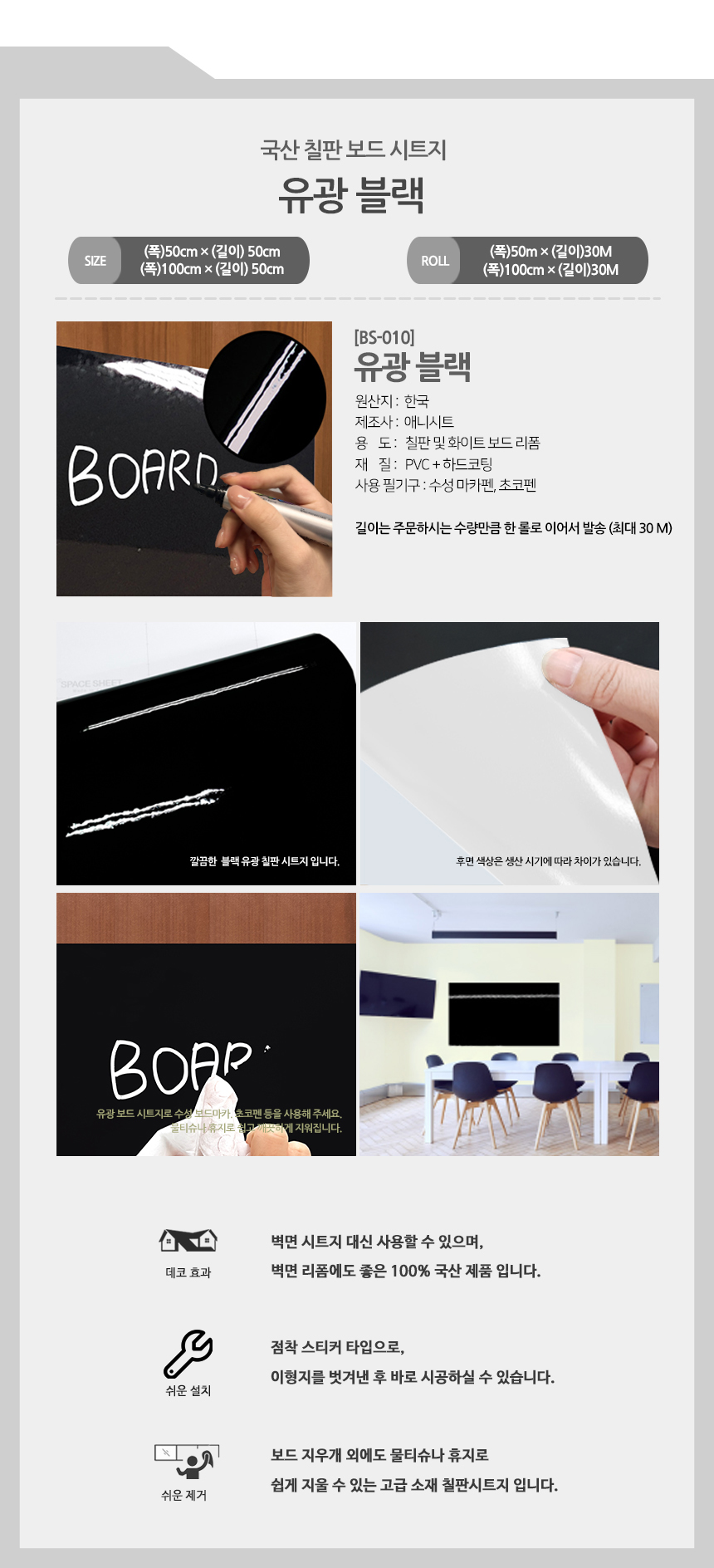 국산 칠판스티커 30M 롤 유광 칼라칠판시트지 (BS)