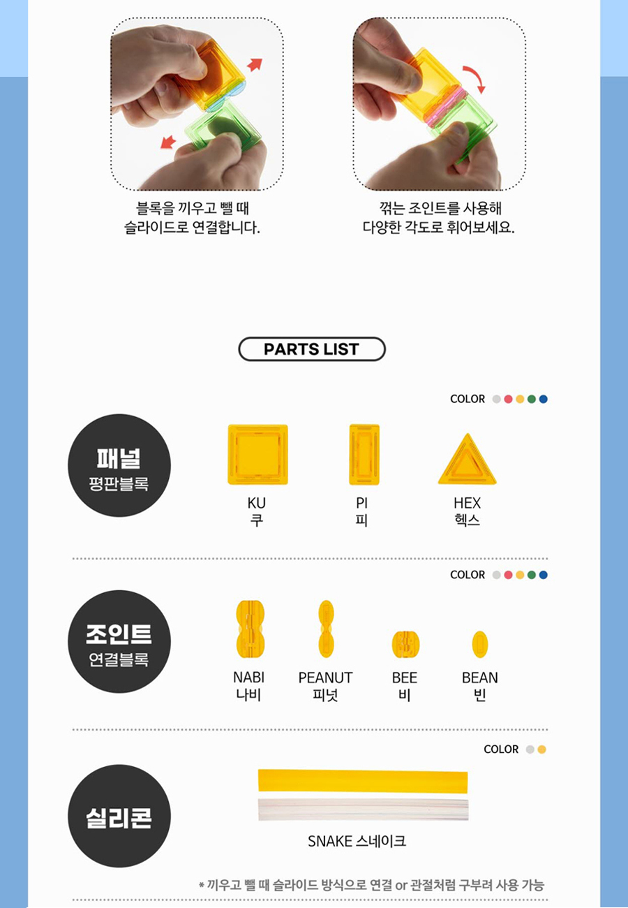 조인트를 사용하여 블럭들을 연결하는 과정에서 소근육 발달에 도움이 됩니다.