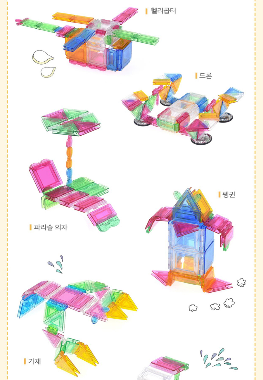 블럭과 블럭을 연결하여 2D 의 단면부터 3D 형태의 입체형 모형을 만들 수 있으며, 아이들의 상상력과 창의력 발달에 도움을 줄 수 있는